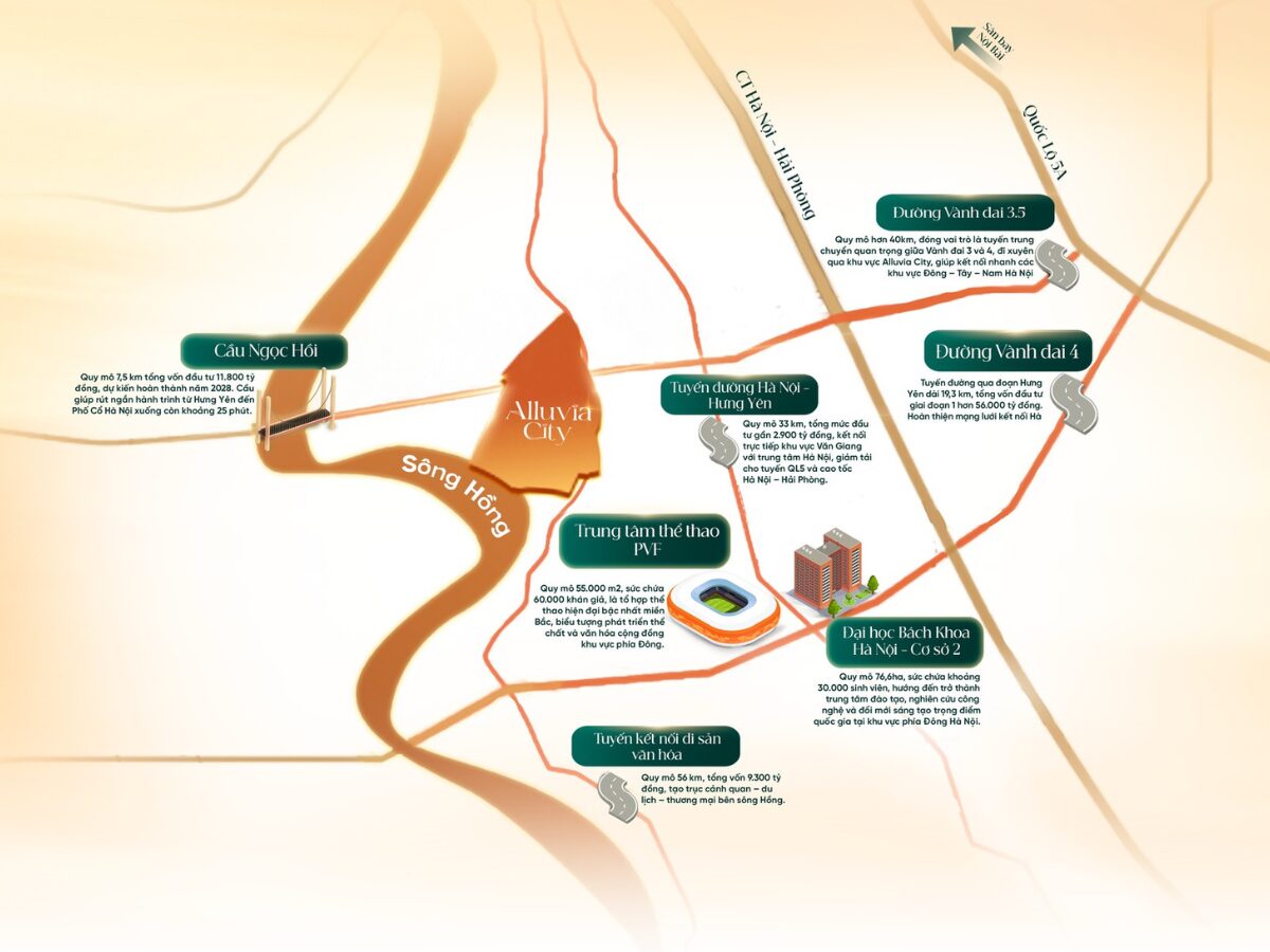 Với loạt công trình giao thông và hạ tầng trọng điểm đang được triển khai, vị trí chiến lược của Alluvia City ngày càng được khẳng định. Dự án không chỉ nằm giữa trung tâm giao thông chiến lược mà còn là mắt xích quan trọng trong mạng lưới phát triển vùng Đông Hà Nội, hướng tới mục tiêu xây dựng đô thị hiện đại, đồng bộ và bền vững.