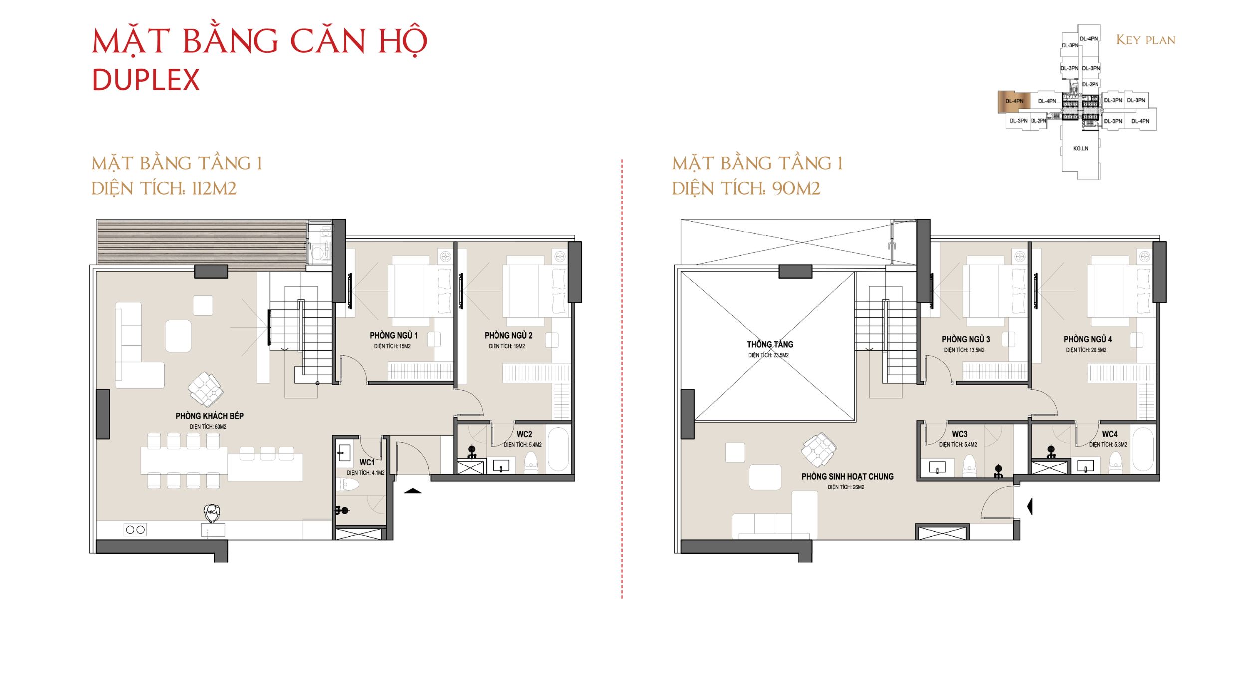 Các căn Duplex thường có diện tích từ khoảng 90m² đến hơn 110m² mỗi tầng, được thiết kế theo phong cách “vertical living” – sinh hoạt theo chiều cao. Tầng dưới là không gian sinh hoạt chung với phòng khách, bếp và 1–2 phòng ngủ; trong khi tầng trên dành cho không gian riêng tư như phòng ngủ master, phòng sinh hoạt chung hoặc khu đa năng.