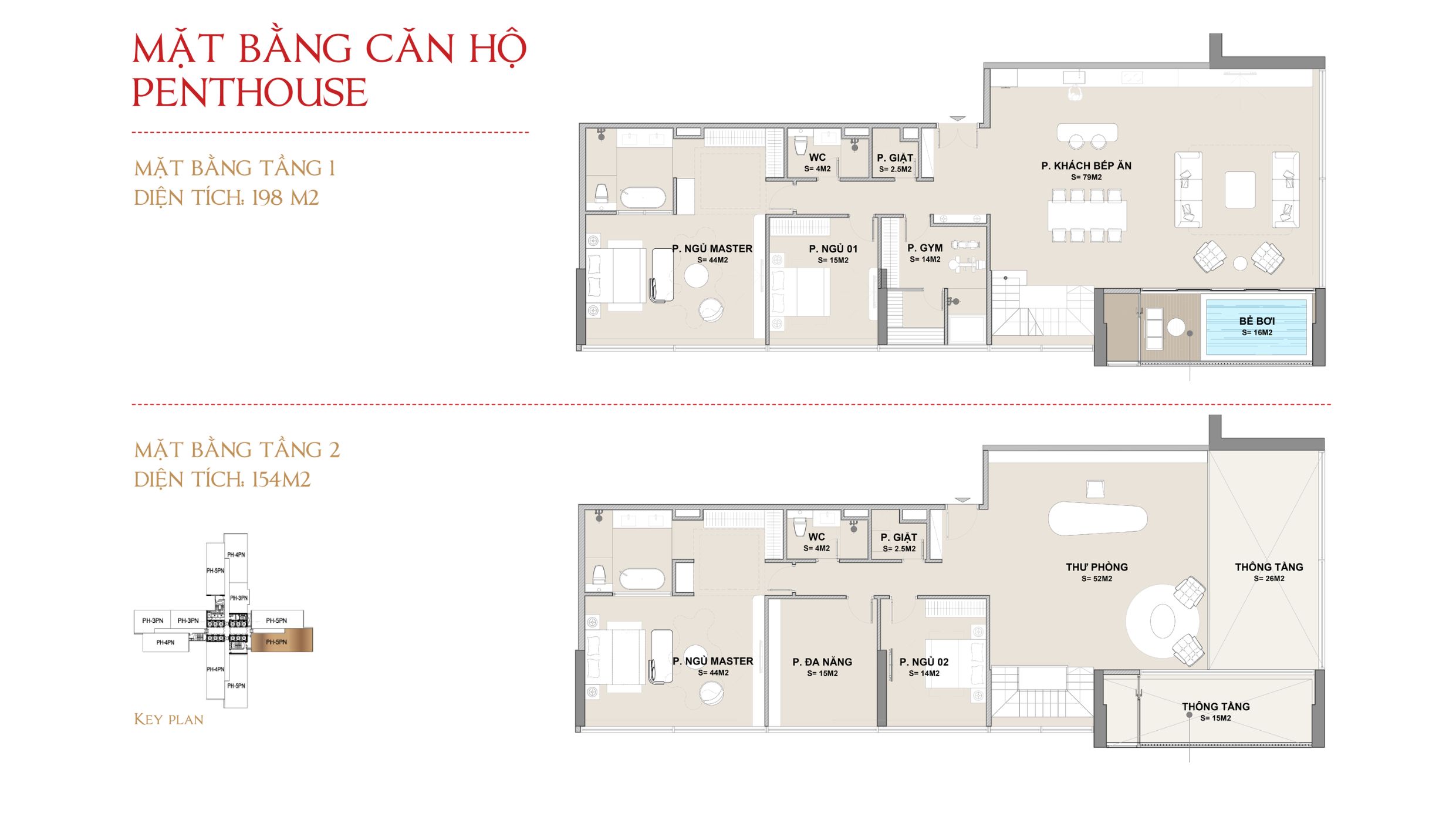 Mỗi tầng chỉ có khoảng 8 căn Penthouse, với diện tích lớn (từ ~150m² đến gần 200m²), thiết kế tối ưu không gian sống sang trọng. Điểm nhấn nổi bật là khu vực phòng khách – bếp rộng lên tới gần 80m², kết nối trực tiếp với ban công lớn hoặc khu vực hồ bơi riêng.