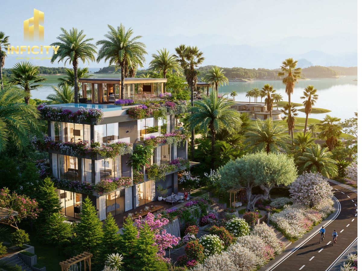 Từng tầng được nghiên cứu bố cục kỹ lưỡng để mọi phòng ngủ đều hướng trọn ra hồ, kết hợp mảng kính lớn đưa thiên nhiên tràn vào không gian sống. Ban công rộng của mỗi phòng được phủ xanh cảnh quan, biến từng góc riêng thành một khu vườn treo.