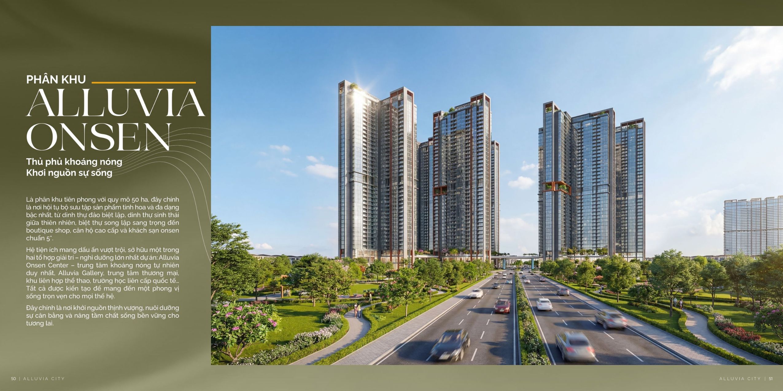 Alluvia Onsen là phân khu tiên phong, được xem là trái tim của toàn bộ dự án. Với quy mô khoảng 50ha, nơi đây hội tụ đầy đủ những sản phẩm bất động sản cao cấp nhất, từ căn hộ cao tầng, biệt thự sinh thái đến boutique shop và khách sạn onsen chuẩn 5 sao.