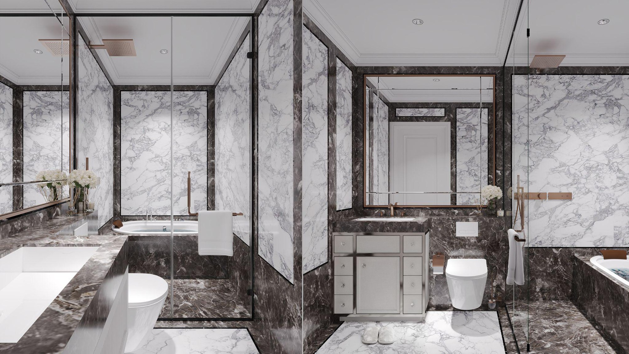 Tại đây, hệ sen tắm ứng dụng công nghệ tiên tiến tạo dòng nước êm ái, thư giãn sau một ngày dài – kết tinh từ hàng thập kỷ nghiên cứu thủy lực và thiết kế công thái học chuẩn châu Âu, với tiêu chuẩn kỹ thuật tương đương khách sạn 5 sao. Kết hợp cùng bồn cầu treo tường, két nước âm tường, vách kính cường lực VFG và các phụ kiện đồng bộ, không gian phòng tắm luôn giữ được vẻ sang trọng như mới và phục vụ trọn vẹn từng khoảnh khắc riêng tư của chủ nhân.