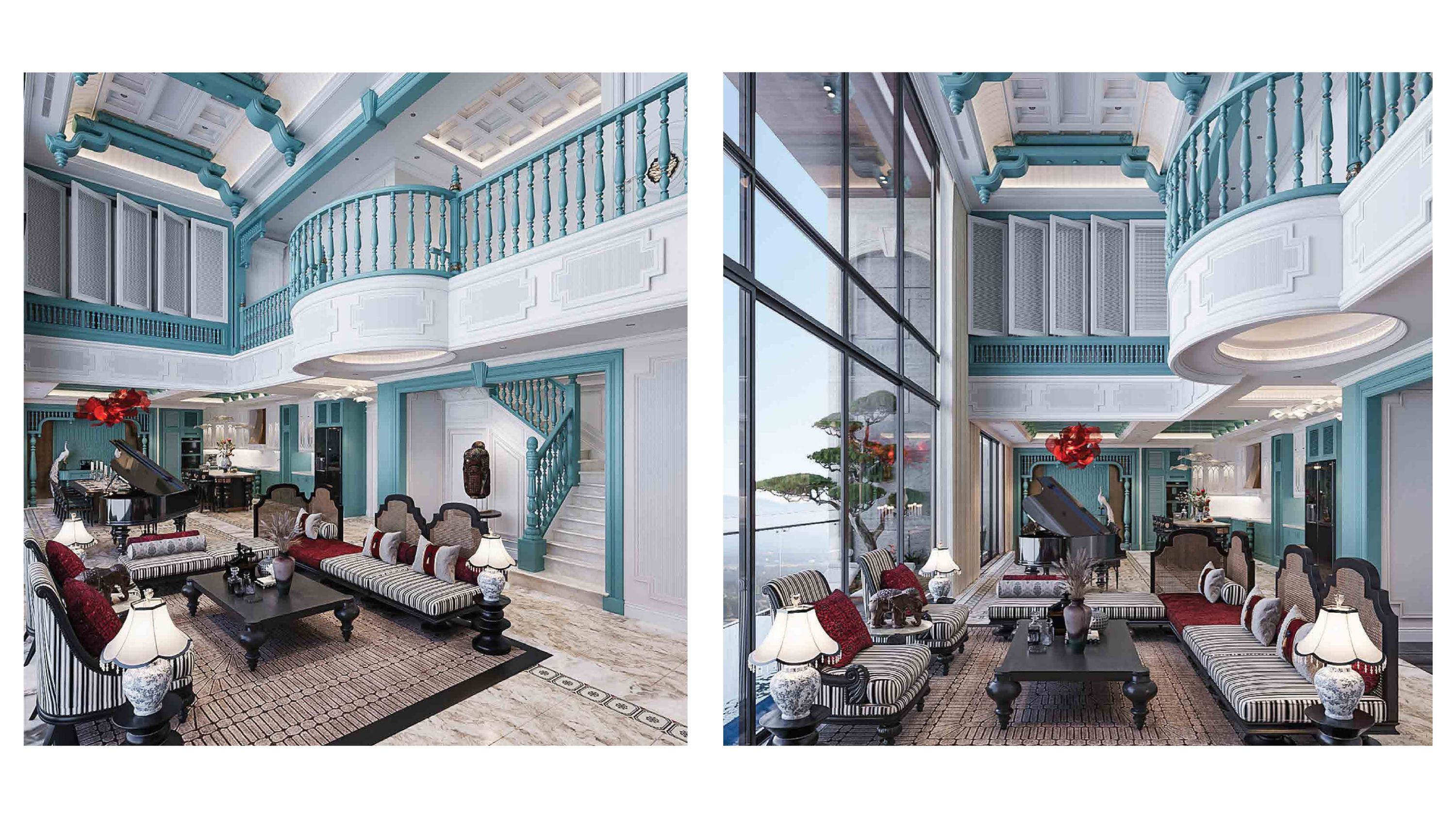 • Nốt nhạc của Không gian & Ánh sáng: Hệ cửa chính cao kịch trần, cửa kính trượt – gấp cách âm, cách nhiệt, nhôm kính đồng bộ và khóa an ninh đa lớp, mở ra những mặt tiền sống rộng thoáng, liền mạch nội – ngoại thất. Ánh sáng tự nhiên được dẫn dắt có chủ đích, tạo nên những “khoảng thở” sang trọng và giàu cảm xúc.