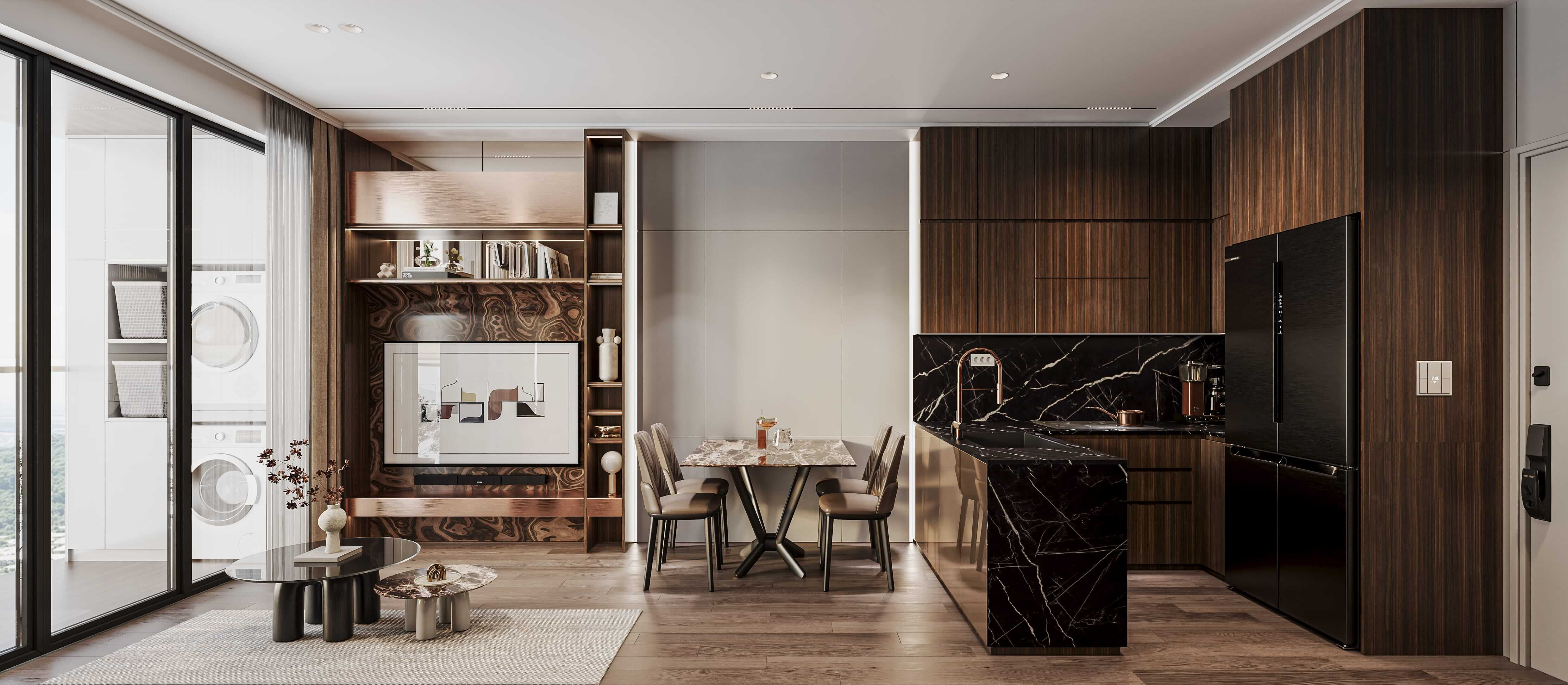 Một điểm đáng chú ý là hệ nội thất và thiết bị liền tường được lựa chọn từ các thương hiệu châu Âu, đã được kiểm chứng trong các công trình cao cấp toàn cầu. Điều này không chỉ đảm bảo chất lượng sử dụng lâu dài mà còn nâng cao giá trị cho thuê, đặc biệt với nhóm khách hàng là chuyên gia nước ngoài hoặc người có yêu cầu cao về tiêu chuẩn sống.
